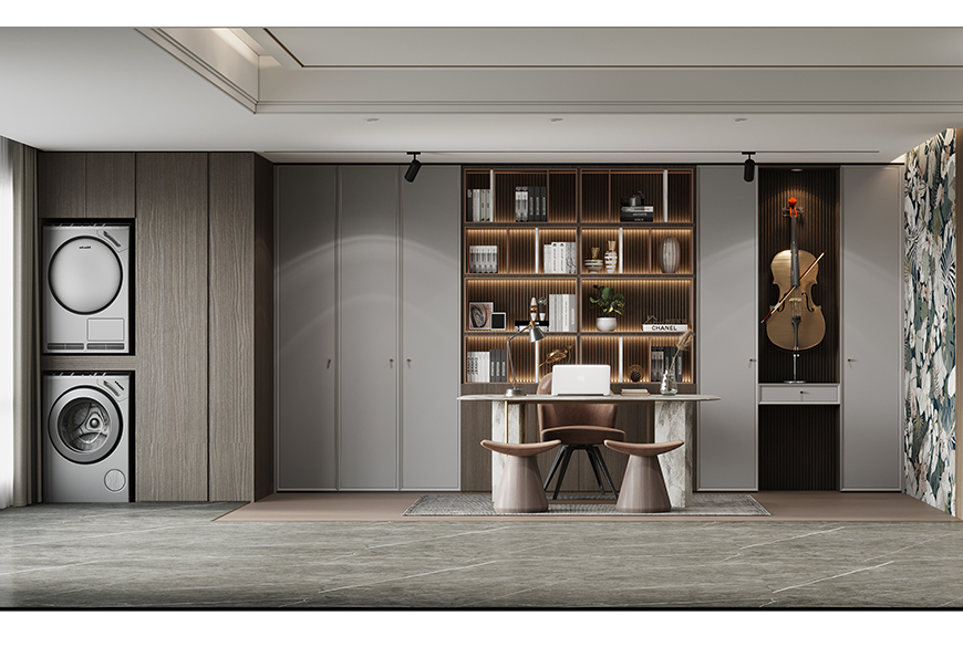 產(chǎn)品亮點(diǎn):書房與陽臺(tái)、客廳采用「半融入」設(shè)計(jì)手法,打造交流無障礙空間。噴繪裝飾板,提供個(gè)性化定制。采用柜中柜結(jié)構(gòu)設(shè)計(jì),將套色融入到家具中,提升了產(chǎn)品的層次感