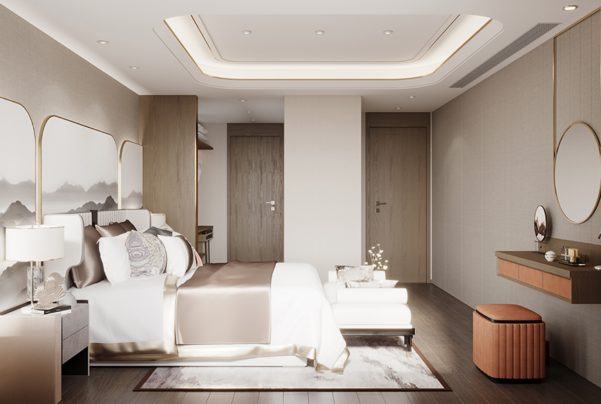 產(chǎn)品亮點:主臥套房,集起居、工作、衣帽、梳妝、主衛(wèi)五大功能為一體。極簡掛墻式衣帽間與新中式風格完美融合,表達對簡約時尚、典雅高貴生活的追求